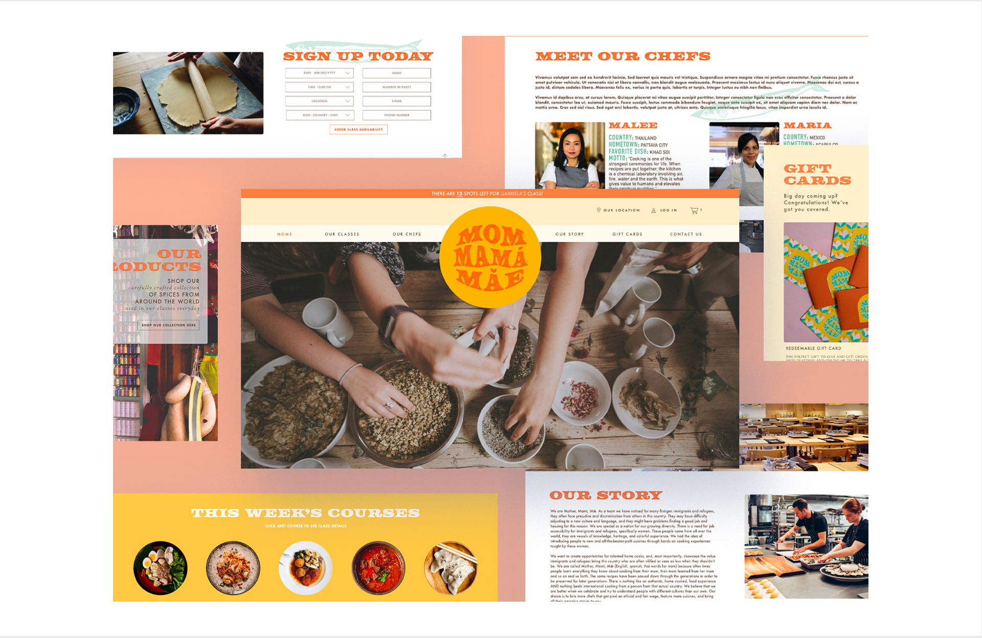 This project was done together as a group by Taen Johnson, Lydia Aimes, Katie Cripe and myself. I was the design director for our website. As a team, we noticed that many first-gen immigrants and refugees often face prejudice and discrimination from others in this country. They may have difficulty adjusting to a new culture and language, and for this reason, they might have problems finding a good job and housing. There is a need for job accessibility for immigrants and refugees, specifically women. Our restaurant is called Mother, Mamá, Mâe (english, spanish, thai words for mom) because often times people learn everything they know about cooking from their mom, their mom learned from her mom and so on and so forth. The same recipes have been passed down through the generations in order to be preserved for later generations. There is nothing like an authentic, home cooked, food experience and nothing beats international cooking from a person from that actual country. We believe that we are better when we celebrate and try to understand people with different cultures than our own. Our dream is to hire more chefs that get paid an ethical and fair wage, feature more cuisines, and bring all their amazing stories to you.